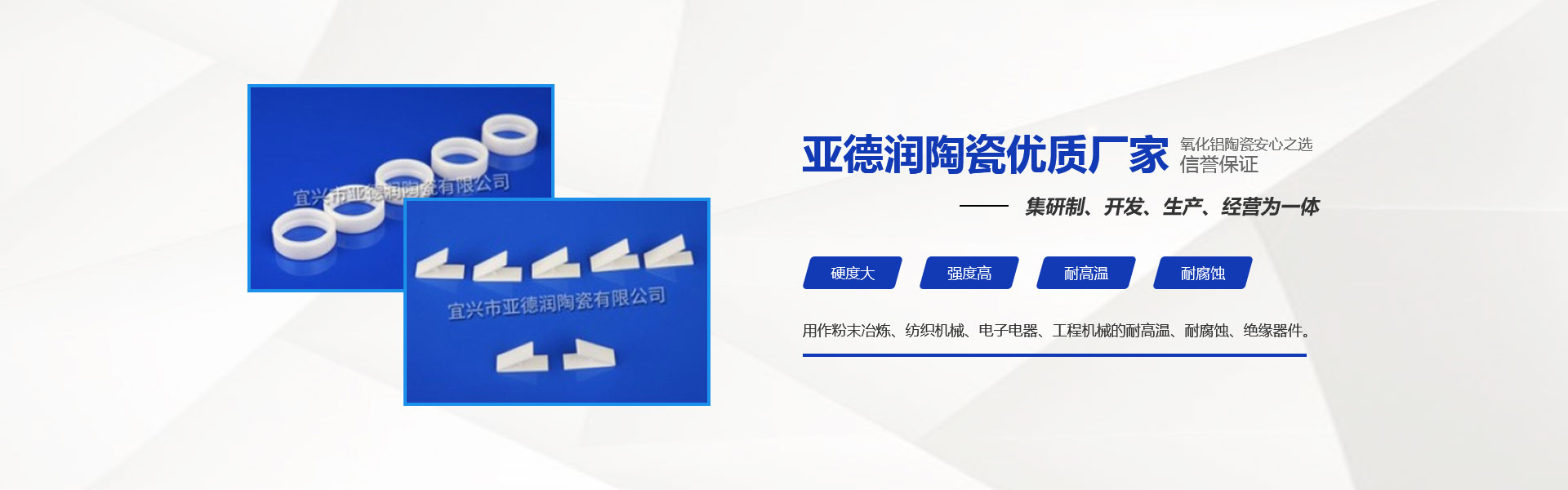 氧化鋁陶瓷,具有硬度大、強(qiáng)度高、耐高溫、耐腐蝕、電氣絕緣性好的特點(diǎn)。廣泛用作粉末冶煉、紡織機(jī)械、電子電器、工程機(jī)械的耐高溫、耐腐蝕、絕緣器件。